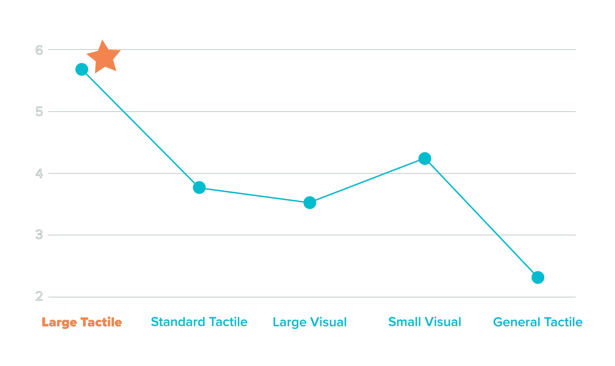 “Results demonstrated that initially training children with large braille tactually led to the best subsequent learning of standard braille. Despite the fact that both initial visual and large tactual learning were significantly faster than learning standard braille, when transferring letter knowledge to standard tactile braille, previous tactile experience with the large pegboard offered the most efficient route. ”